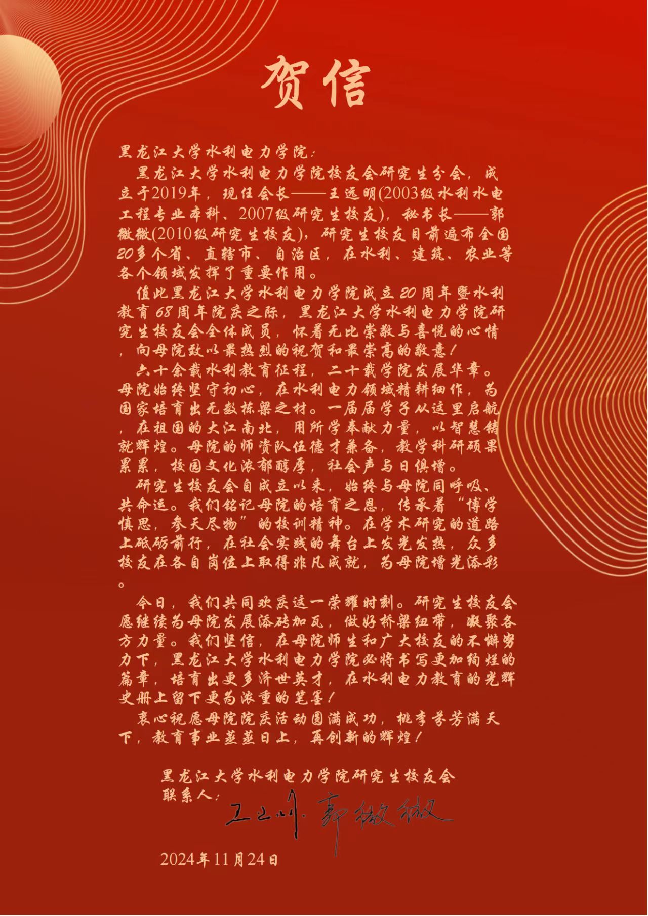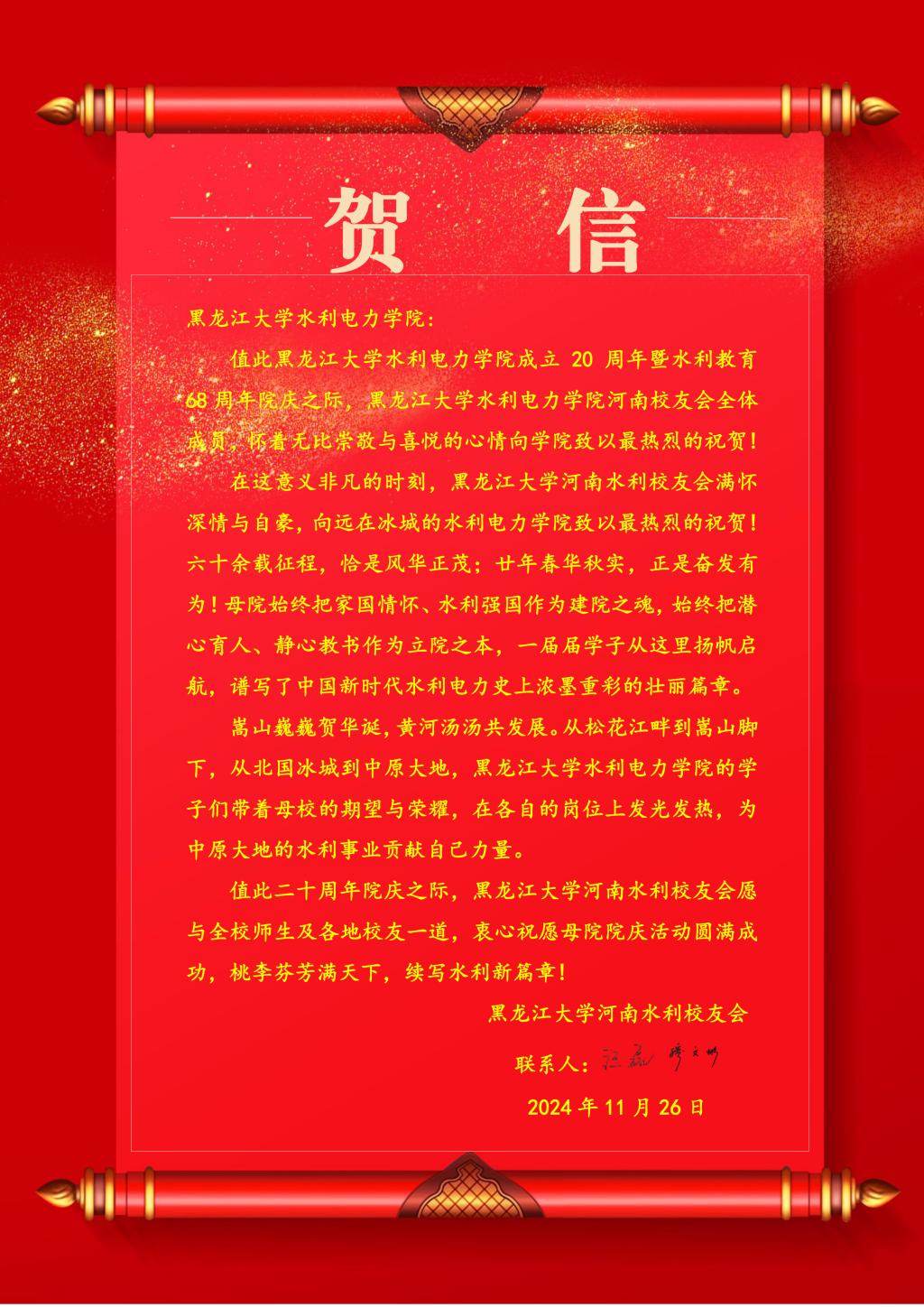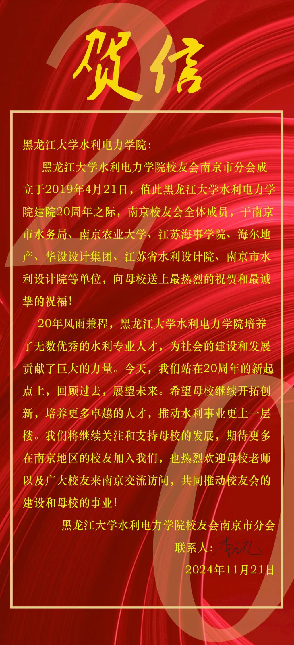 时光荏苒,不觉经年。今年是yl23455永利集团建院20周年暨水利教育68周年,yl23455永利集团秉持初心,一路砥砺前行,以卓越师资力量,培养优秀水利人才走向世界各地。恰逢建院20周年,各地校友会纷纷致来贺信。满载诚挚祝福,愿yl23455永利集团再谱华章。yl23455永利集团将陆续分享这些珍贵贺信,与大家一同领略学院与校友之间深切的情谊(排名不分先后)
