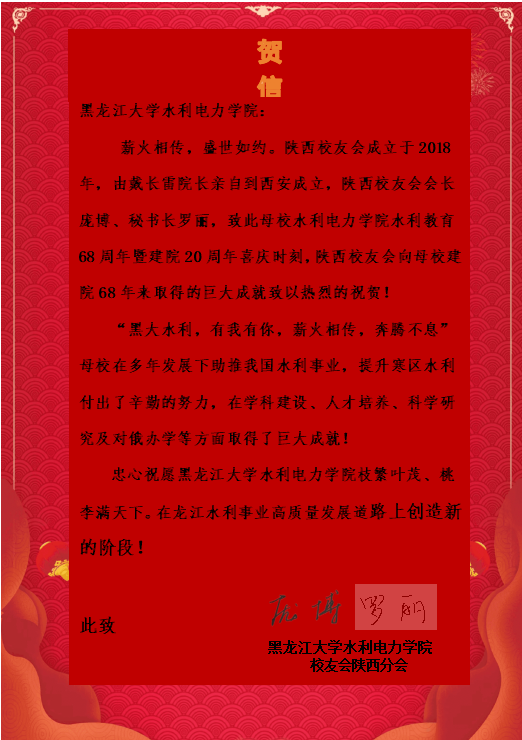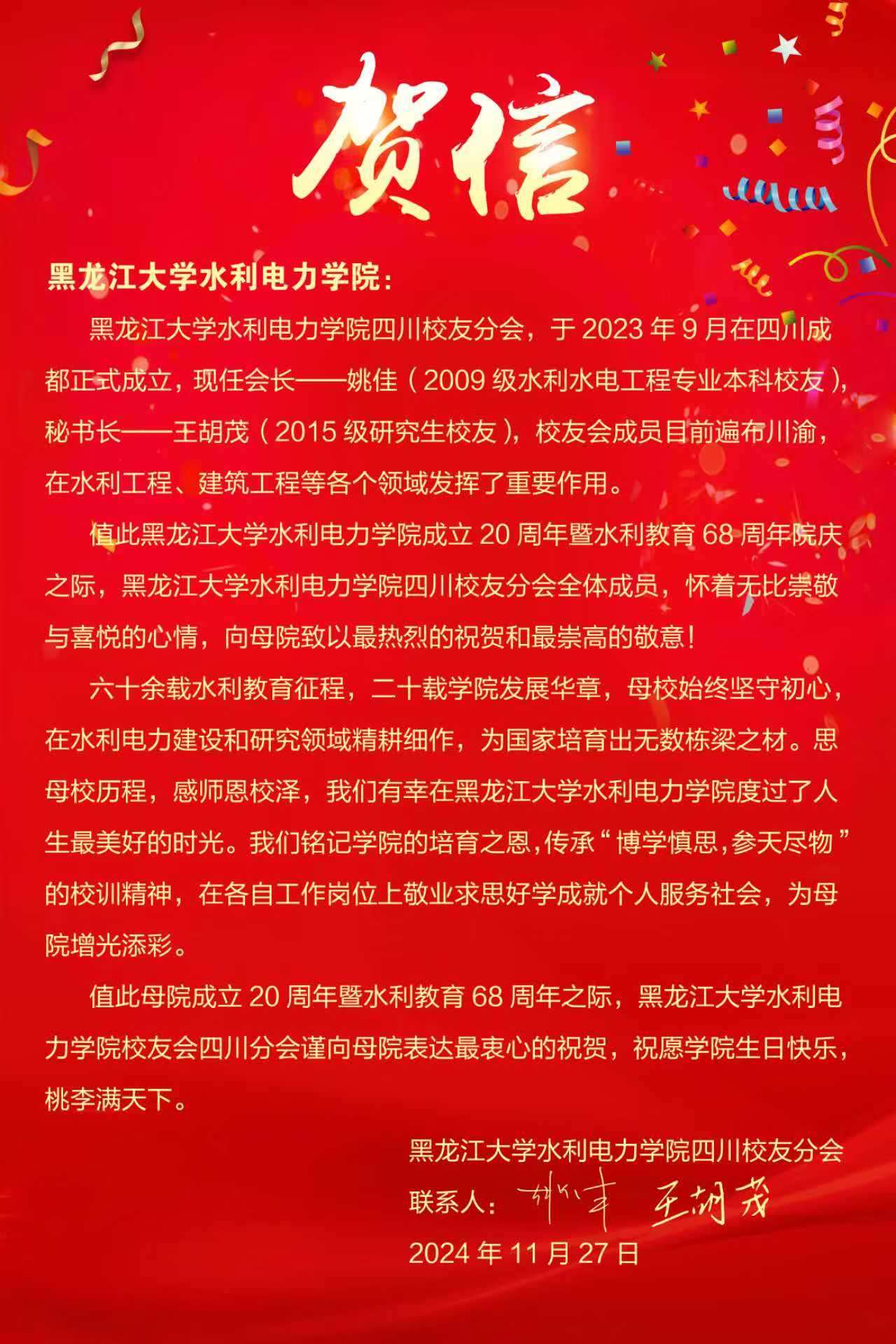 时光荏苒,不觉经年。今年是yl23455永利集团建院20周年暨水利教育68周年,yl23455永利集团秉持初心,一路砥砺前行,以卓越师资力量,培养优秀水利人才走向世界各地。恰逢建院20周年,各地校友会纷纷致来贺信。满载诚挚祝福,愿yl23455永利集团再谱华章。yl23455永利集团将陆续分享这些珍贵贺信,与大家一同领略学院与校友之间深切的情谊(排名不分先后)