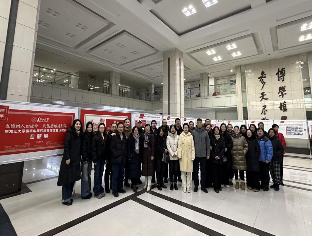 本次专题展以丰富详实的图文资料为核心载体,系统勾勒出党的十八大以来我国民族团结进步事业的发展历程与取得的历史性成就。展览重点聚焦本校实践,全面呈现了学校在推动各民族交往交流交融、主动服务国家边疆治理与高质量发展、精细化加强民族学生教育培养体系建设以及促进多民族文化互鉴共荣等领域的创新探索与标志性成果。展览精心设置“历史脉络”“理论指引”“实践成就”“龙江贡献”四大板块,师生们循着板块脉络逐一学习,在历史与现实的交织、理论与实践的呼应中,对新时代党的民族工作方针政策的核心要义与生动实践有了更为全面系统、深刻透彻的理解。