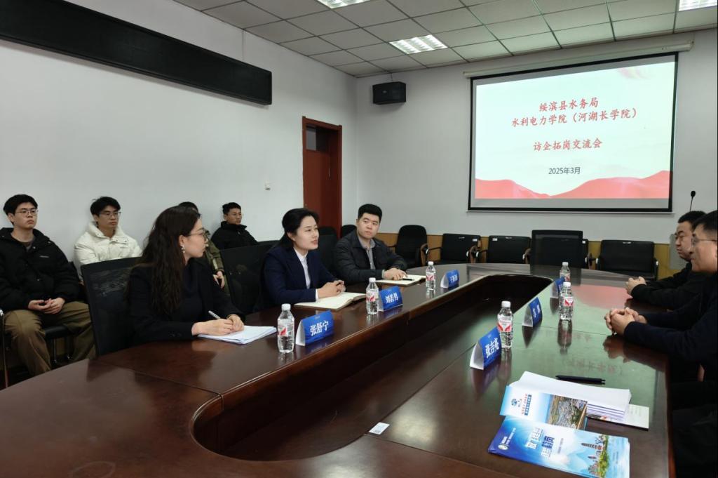 为深入贯彻落实“访企拓岗”专项行动工作部署,拓宽毕业生就业渠道和岗位资源,持续推进就业工作,3月27日,yl23455永利集团与绥滨县水务局在学院420会议室召开访企拓岗交流会。yl23455永利集团党委副书记刘若男、毕业年级辅导员王新源、张舒宁和部分2025届毕业生参加会议。绥滨县水务局局长苏辉、绥滨县水务局党组成员张佳兴、绥滨县农田水利建设中心主任张吉亮出席会议。